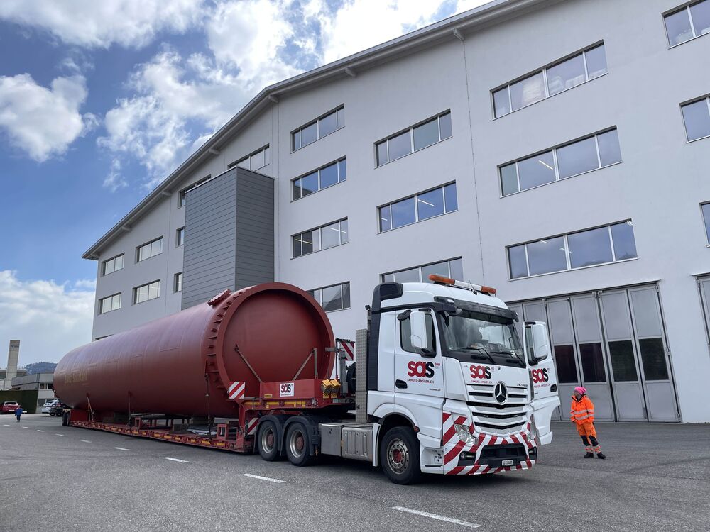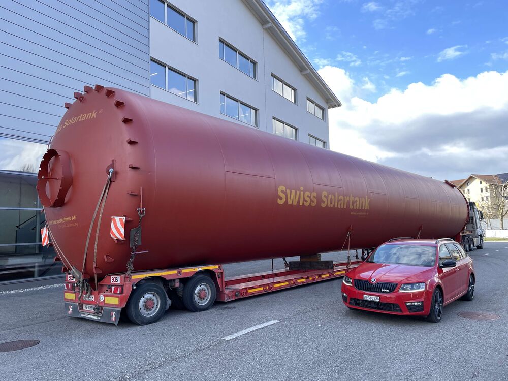 Der imposante Wärmespeicher wurde am Freitag, 27. März 2026 in Oberburg im Kanton Bern auf einen langen Tieflader geladen. In der Nacht auf Samstag erfolgte dann der anspruchsvolle Spezialtransport in den Kanton Aargau und am Folgetag die präzise Aufstellung mit einem grossen Pneukranwagen.