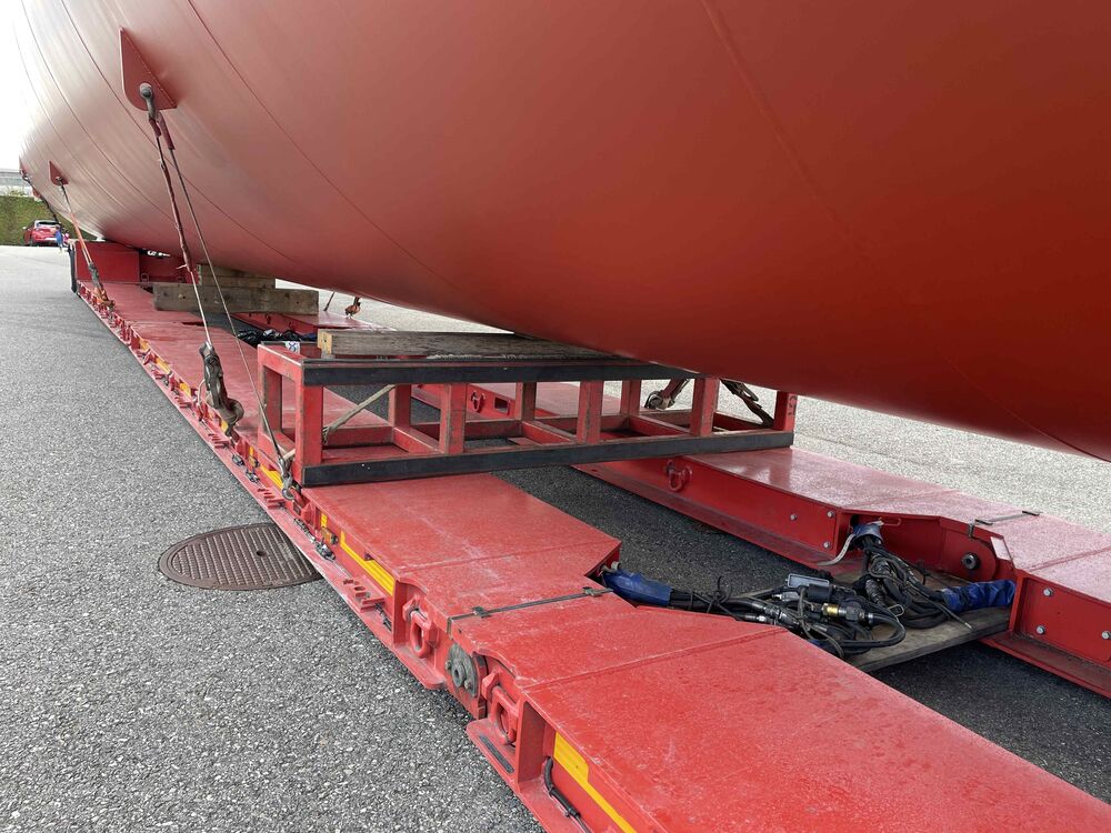 Der imposante Wärmespeicher wurde am Freitag, 27. März 2026 in Oberburg im Kanton Bern auf einen langen Tieflader geladen. In der Nacht auf Samstag erfolgte dann der anspruchsvolle Spezialtransport in den Kanton Aargau und am Folgetag die präzise Aufstellung mit einem grossen Pneukranwagen.